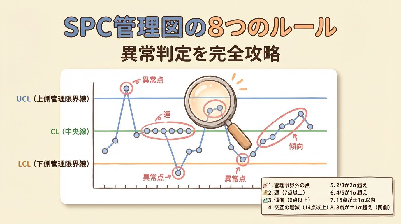 😣 こんな経験はありませんか? 管理図にプロットしたら「UCLは超えていないのに異常だ」と言われた 客先監査で「8つのルールでSPC管理していますか?」と聞かれて答えられなかった 「連 ...