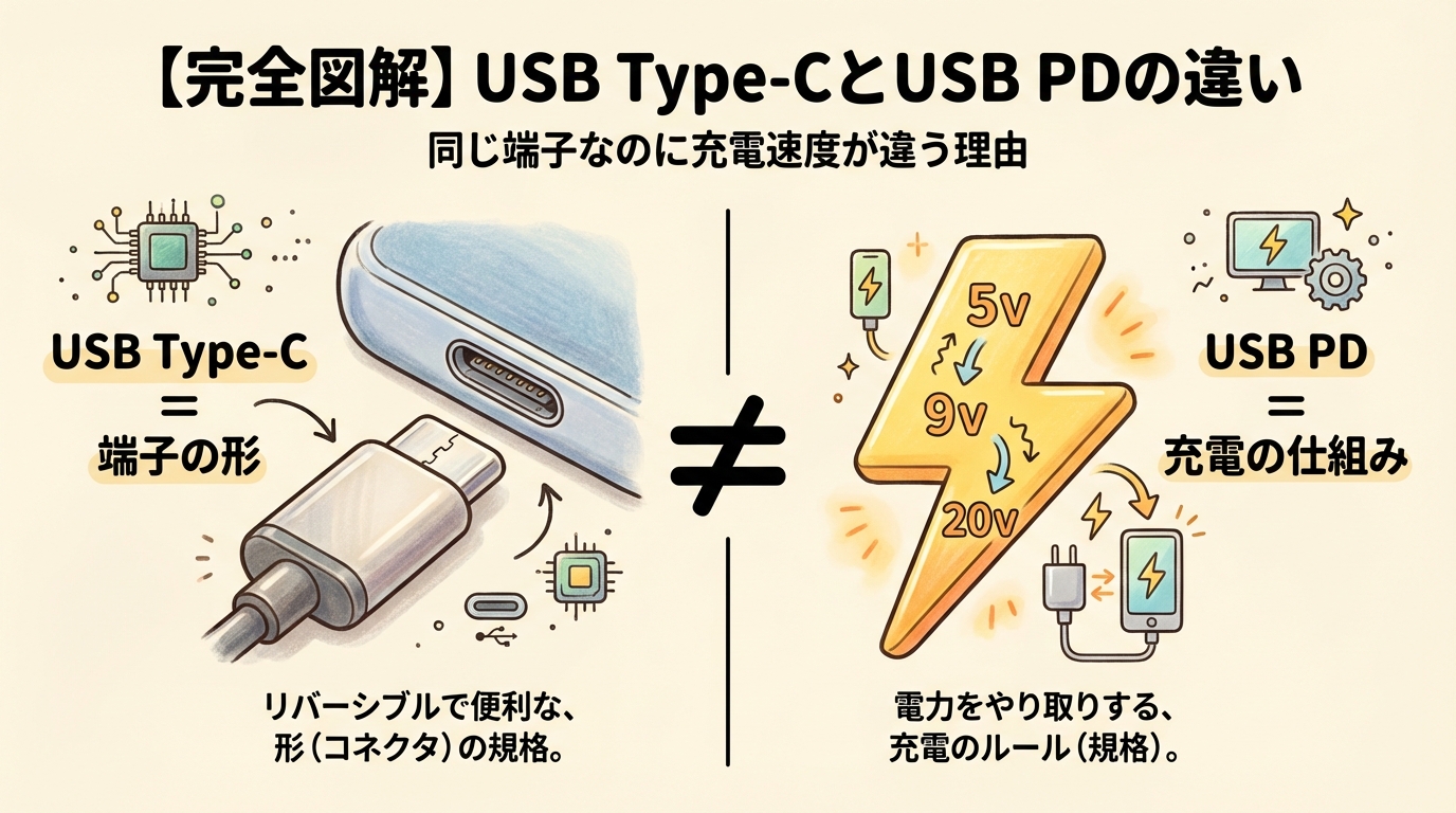 【完全図解】USB Type-CとUSB PDの違い|「同じ端子なのに充電速度が違う」を初心者が5分で理解するガイド