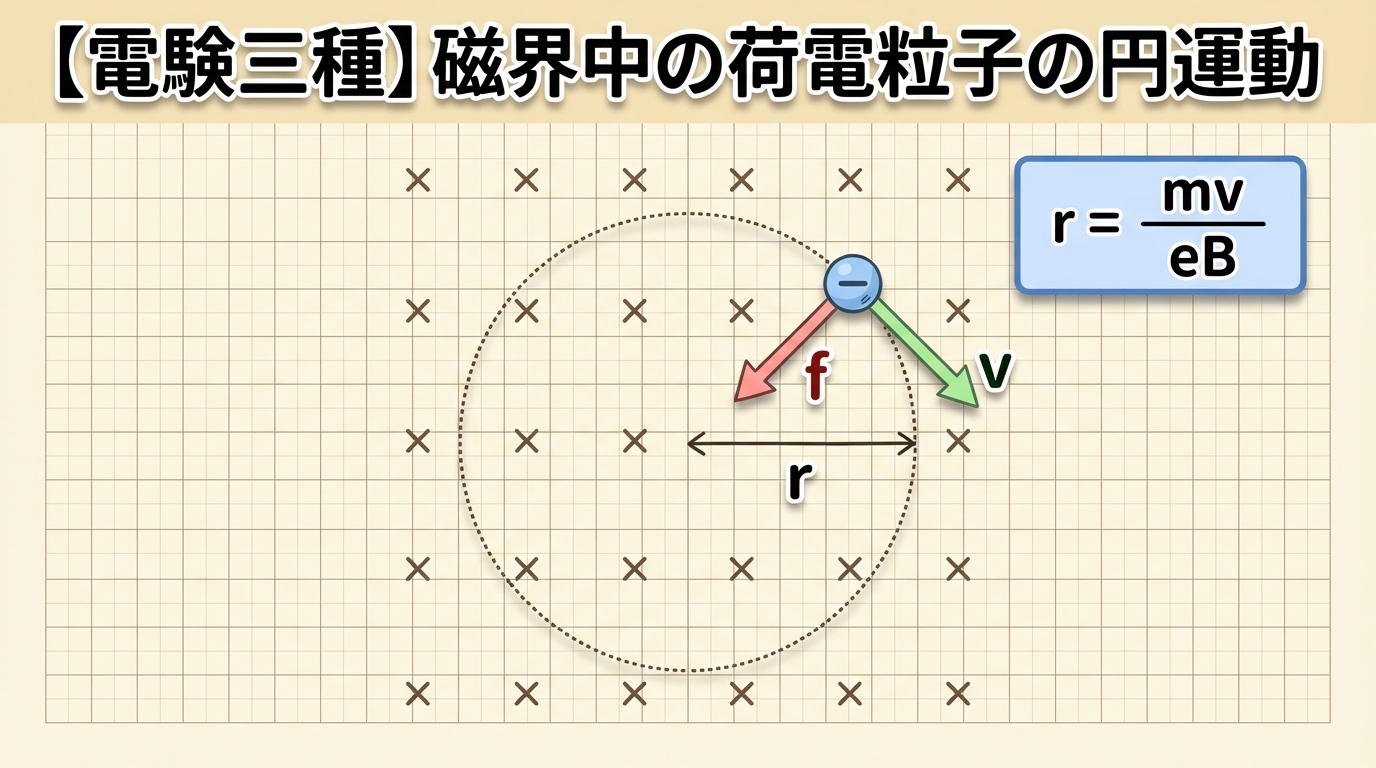 😣 こんな経験はありませんか? 「磁界中で電子が円運動する」と言われても、なぜ「円」になるのかイメージできない r = mv/(eB) の公式を丸暗記しているけど、どう導出したのかわか ...