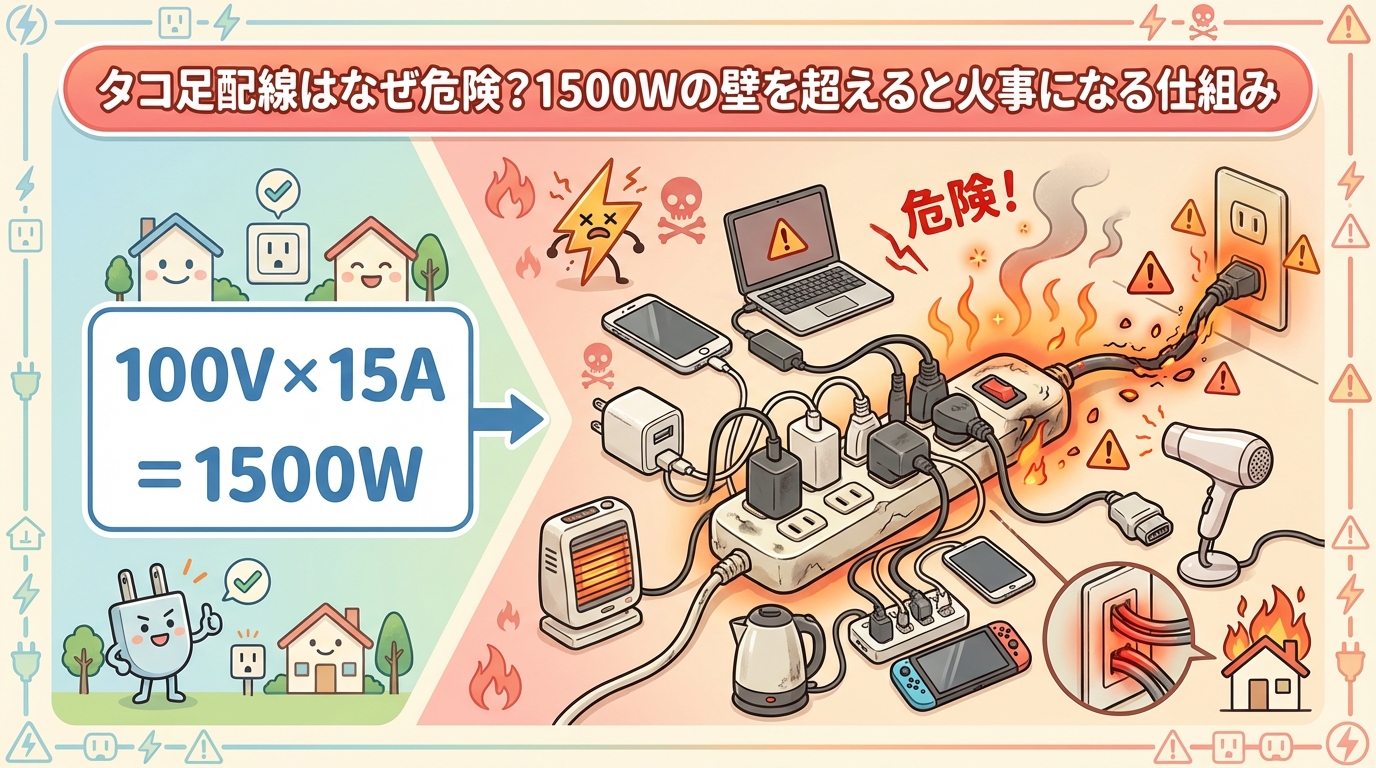 タコ足配線はなぜ危険?|「1500Wの壁」を超えると火事になる仕組みをオームの法則で完全理解