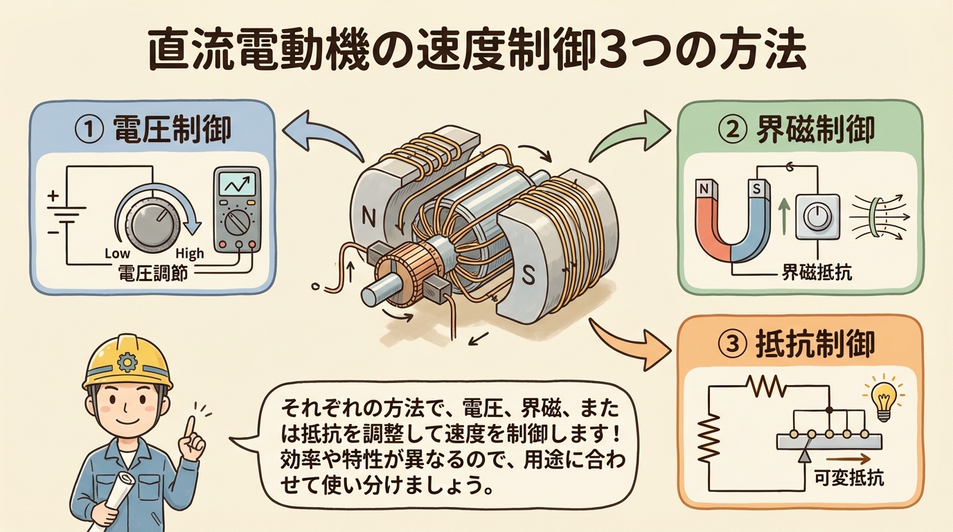 直流電動機の速度制御と始動法|電圧制御・界磁制御・抵抗制御を比較