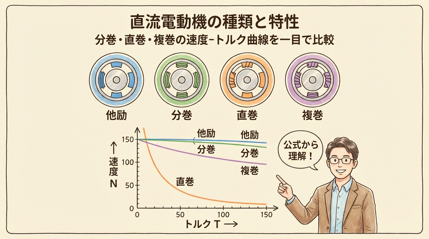 😣 こんな経験はありませんか? 「分巻」「直巻」「複巻」── 名前は知ってるけど、何が違うのか説明できない 速度-トルク曲線を4本並べられても、どれがどれか区別がつかない 過去問で「直 ...