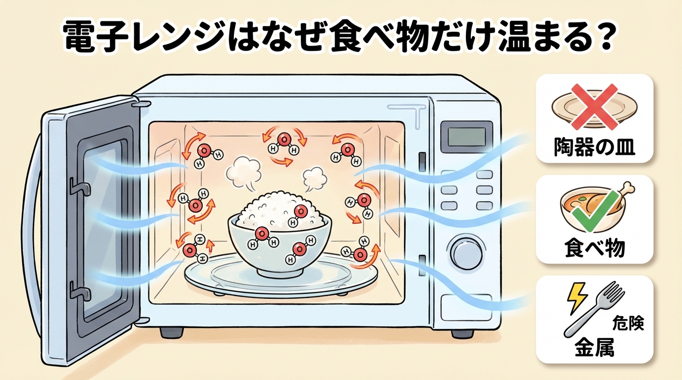 電子レンジはなぜ食べ物だけ温まる?|「マイクロ波」が水分子を揺さぶる仕組みを中学生でもわかるように解説