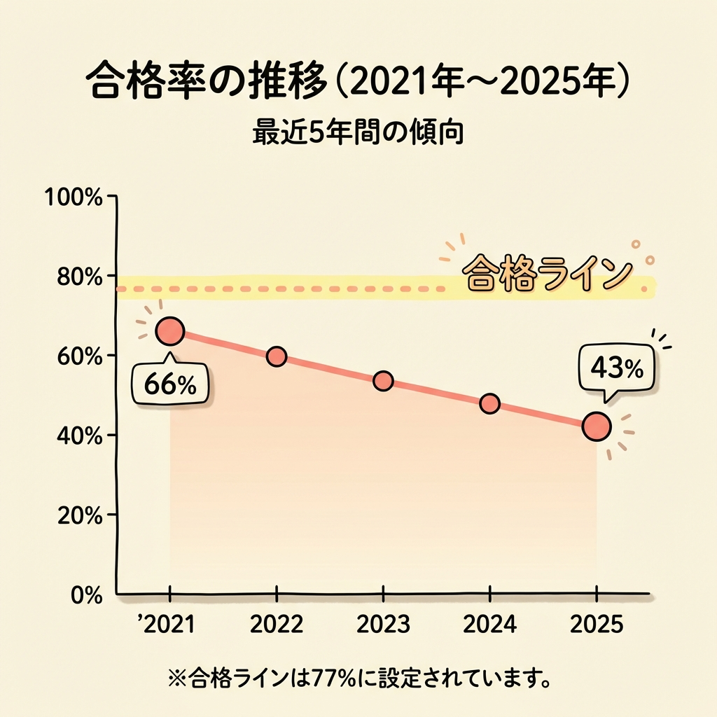 - 合格率は約43〜48%、合格ラインは正答率約77%