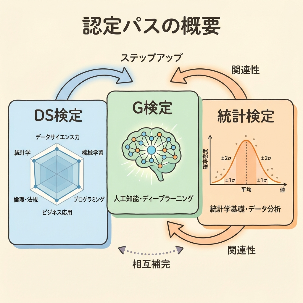 DS検定は3領域を「広く浅く」カバーする試験です。まずDS検定で全体像を掴み、その後に興味が湧いた分野を深堀りする(統計を深掘りするなら統計検定、AIを深掘りするならG検定)という順番が最も効率的です。