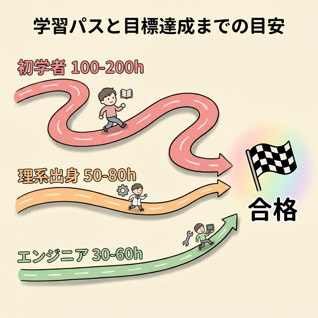 - 勉強時間は初学者で100〜200時間、統計知識があれば50〜80時間が目安