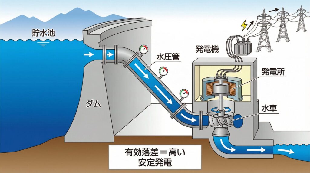 仕組み ダムで水を貯め、水圧管を通して水車に落とす