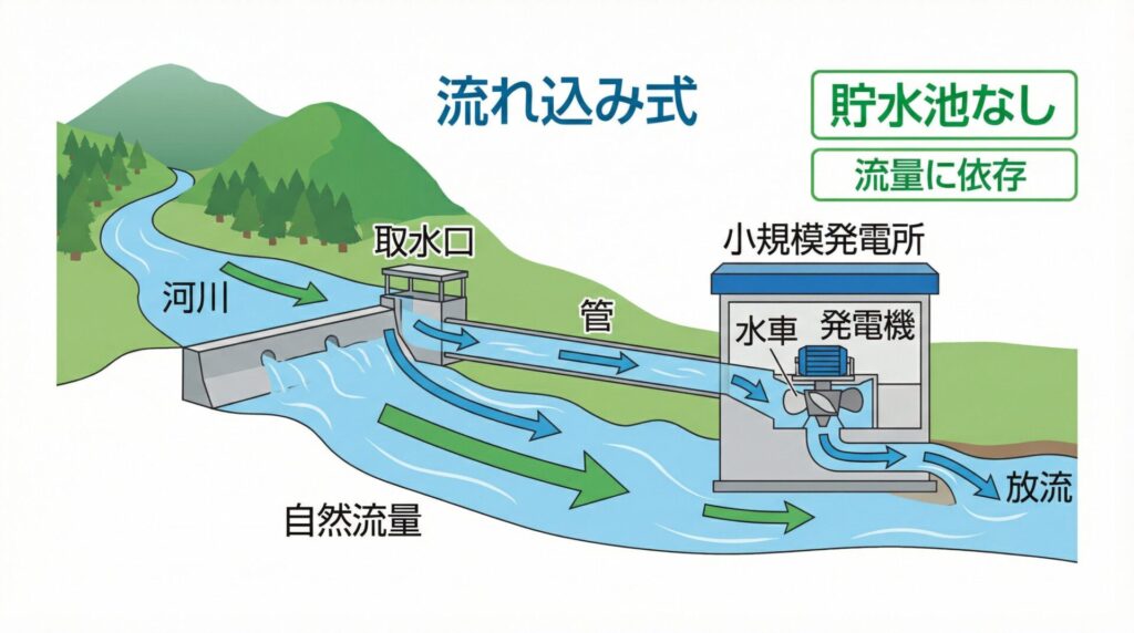 ダムのような大きな貯水池を作らず、「川の水を少し横に引いて、そのまま水車を回す」というイメージですね。