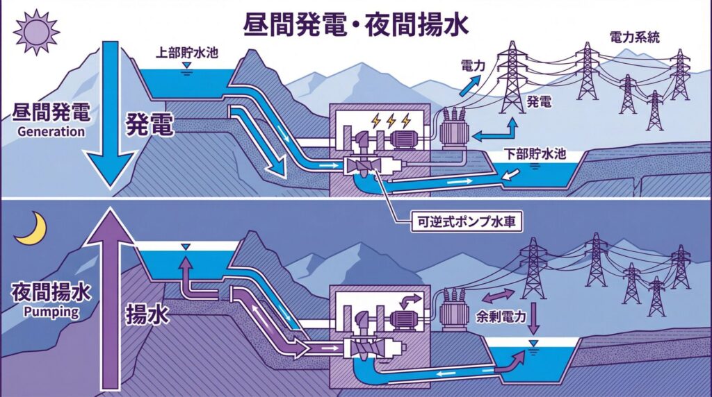 イメージは「昼間は水を落として発電 → 夜間に安い電力で水を汲み上げる → また昼間に発電」というサイクルですね。