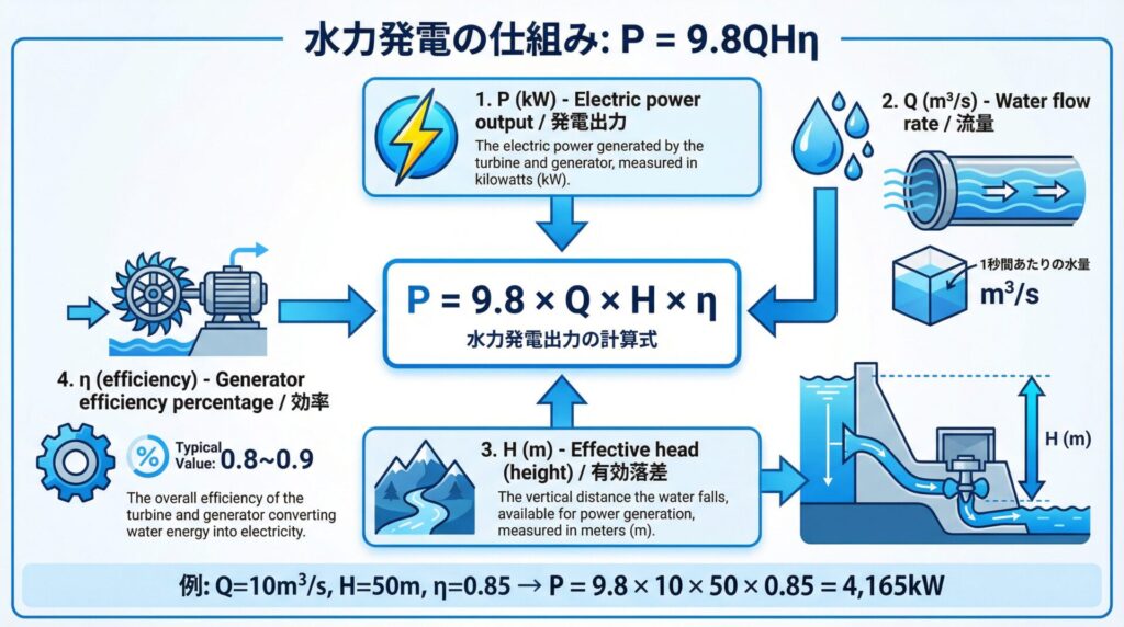 📐 水力発電の公式|P = 9.8 × Q × H × η を完全攻略