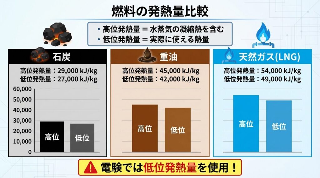 | 低位発熱量 | 水蒸気の凝縮熱を除いた、実際に利用できる熱量 | 👈 こっちを使う! |