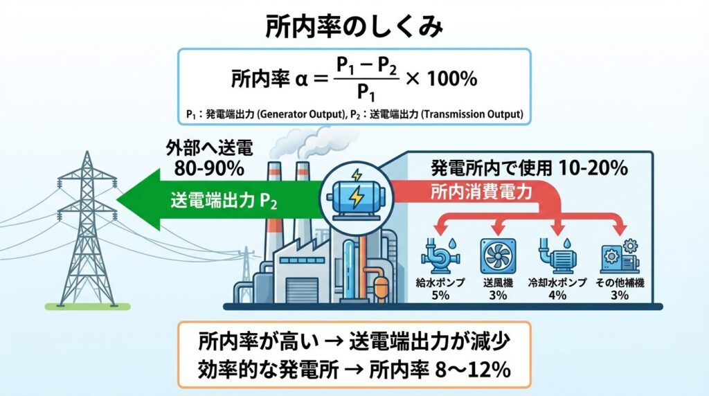 - 所内率(α): 発電所内で消費される電力の割合。P₂ = P₁ × (1 - α/100)