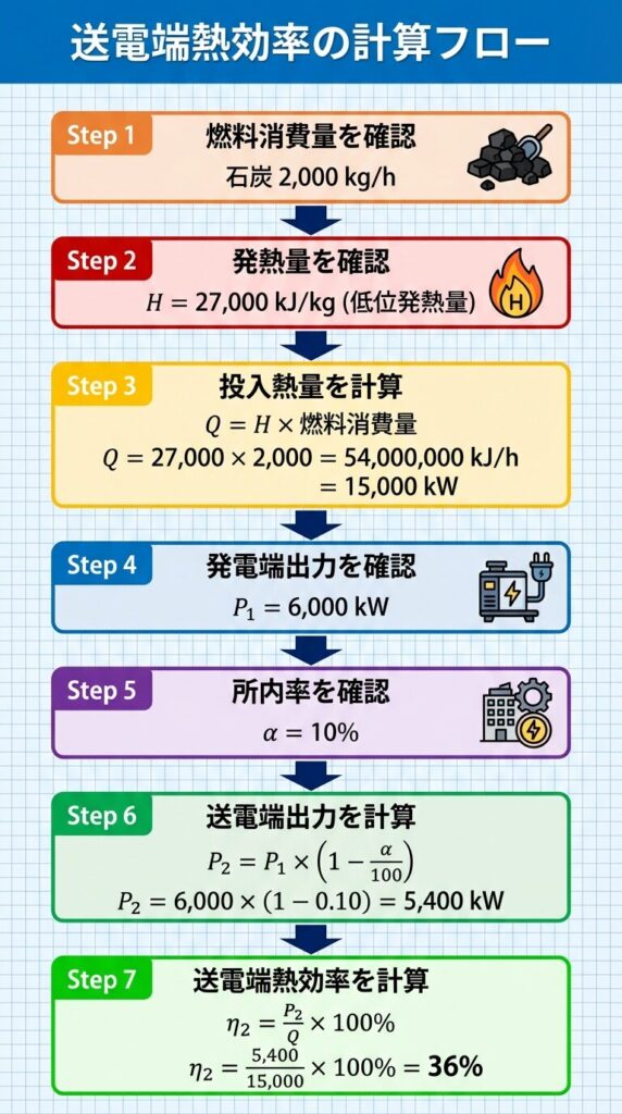 送電端熱効率は、η₂ = η₁ × (1 - α/100)の公式を使えば一瞬で求まります! 投入熱量Qを2回計算する必要なし!