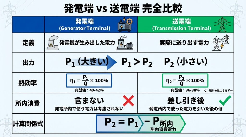 - 熱効率: 発電端(η₁) > 送電端(η₂)。送電端はη₂ = η₁ × (1 - α/100)で一発計算!