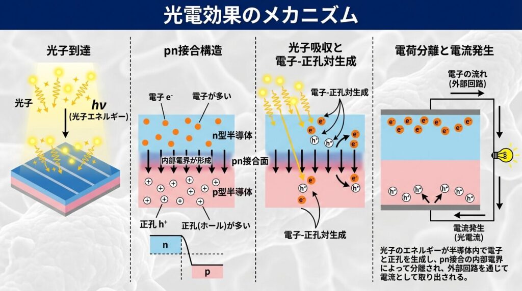 - 光電効果: 光子がpn接合に当たり、電子・正孔ペアが発生して電流に