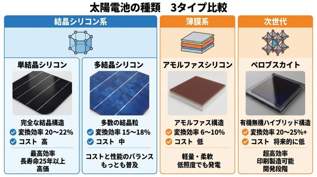 🔷 太陽電池の種類|3タイプの違いと特徴