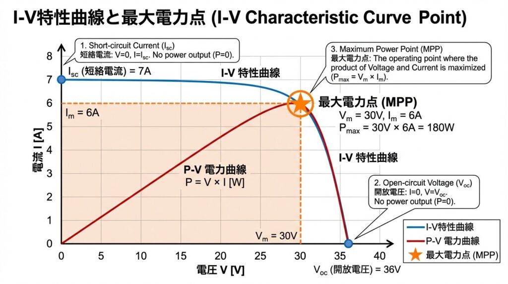 - I-V特性: 最大電力点(MPP)は、P=V×Iが最大になる点