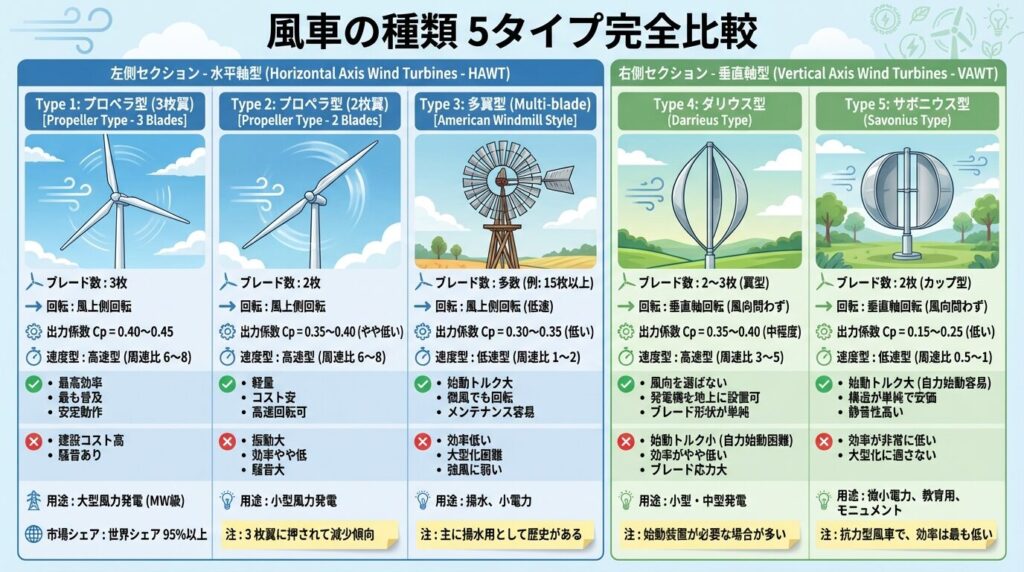 - 風車5種類(水平軸3種・垂直軸2種)の違い