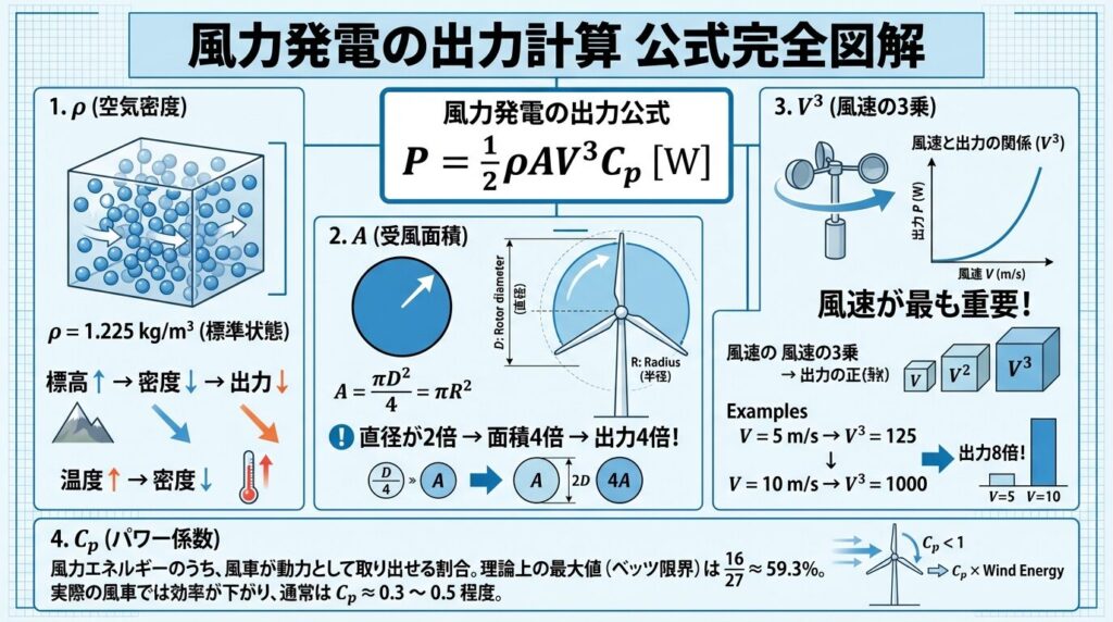 - 出力公式: P = ½ρAV³Cp、風速2倍で出力8倍!