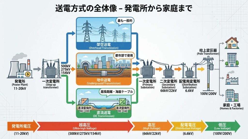 次の図で、送電方式の全体像を視覚的に確認しましょう! 👇
