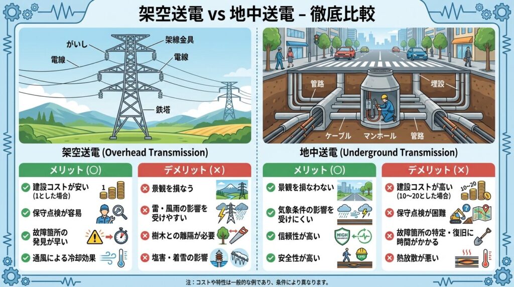 架空送電と地中送電は、コスト・保守性・景観の点で大きく異なります。詳しい比較を次の図で確認しましょう! 👇