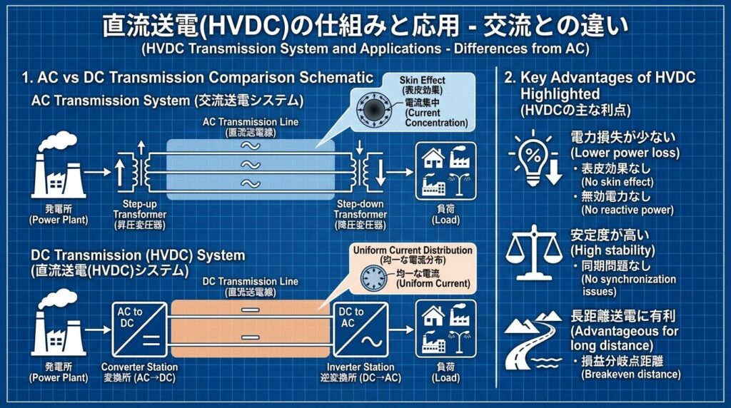 | 直流送電(HVDC) | 交流を直流に変換して送電 | 超長距離・海底ケーブル・周波数変換 |
