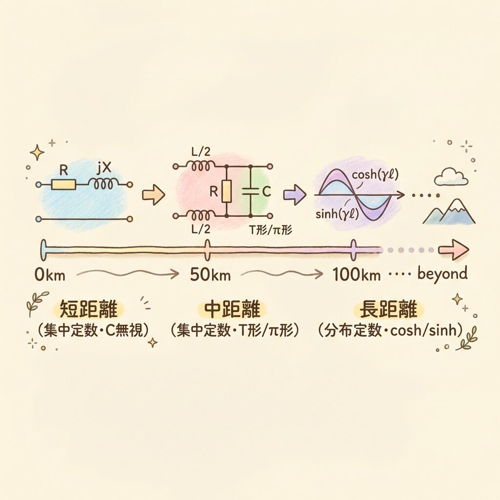 - 短距離・中距離・長距離の分類基準(km)と、それぞれで使う等価回路