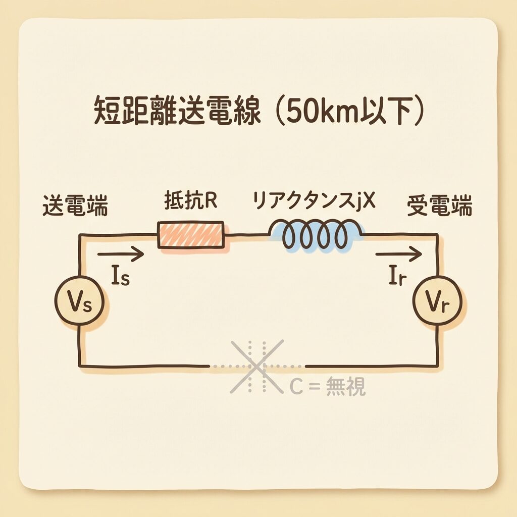 | 短距離 | 50 km 以下 | 直列インピーダンスのみ (R + jX) |