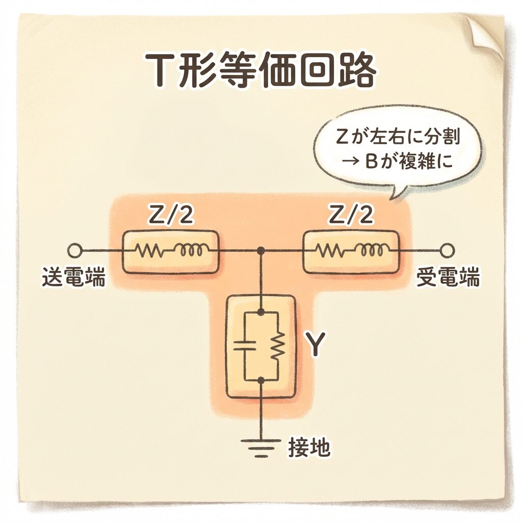 - 中距離(50〜100 km):集中定数として扱い、T形またはπ形等価回路を使う。A = D = 1 + ZY/2