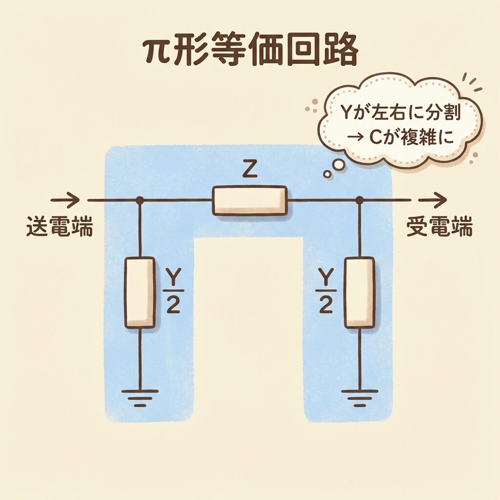 π形等価回路は、T形とは逆の発想です。インピーダンスŻは中央に1個だけ配置し、アドミタンスẎを左右に半分ずつ(Ẏ/2)分けて配置します。ギリシャ文字の「π(パイ)」の形に見えることからこの名前です。