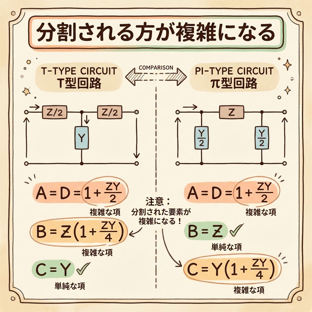 ここに美しい対称性があります。T形では「Żが2分割されるからBに補正項がつく」。π形では「Ẏが2分割されるからCに補正項がつく」。分割される方が複雑になるというルールを覚えれば、もう混同しません。