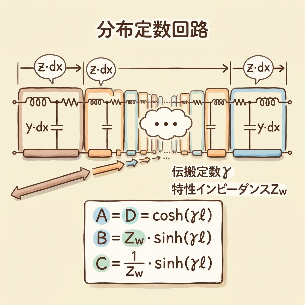 こう長が100 kmを超えると、線路定数を「1か所にまとめる」集中定数の近似ではもはや誤差が大きくなります。線路全体にわたってR・L・C・Gが連続的に分布していると考え、「分布定数回路」として扱います。