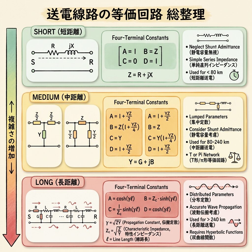 短距離 → 中距離 → 長距離の順に、四端子定数が段階的に複雑になっていきます。短距離の「A=1, B=Z, C=0」が基本形であり、ここにŻẎの補正項が加わると中距離、cosh・sinhになると長距離です。「短距離がベース。距離が伸びるほど補正が増える」という感覚で覚えましょう。