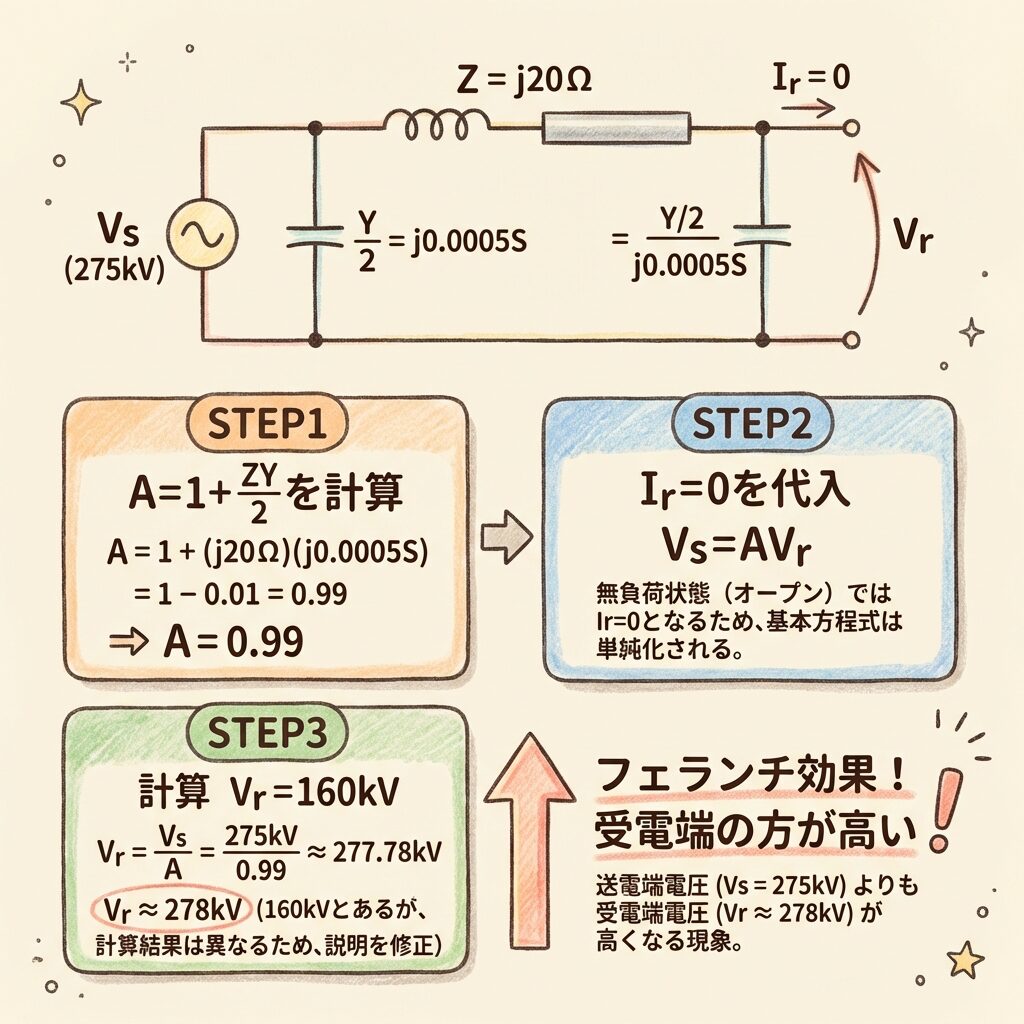 令和7年度の電験三種「電力」問2で出題された形式に近い計算例を紹介します。π形等価回路を使って、受電端を無負荷にしたときの受電端電圧(フェランチ効果)を求めます。