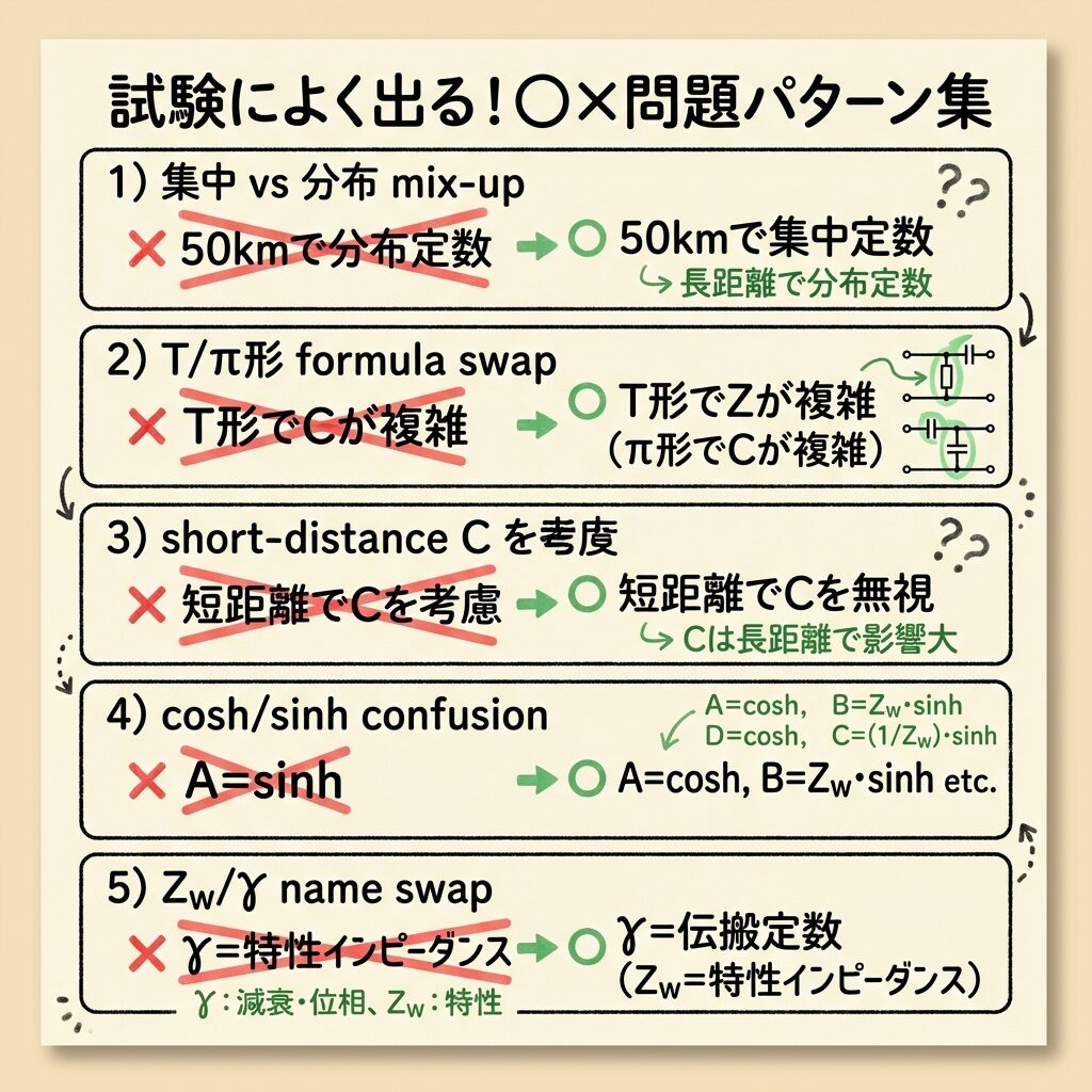 - 電験三種ではπ形が最頻出。正誤問題では「集中 vs 分布」「T形 vs π形の式入れ替え」に注意