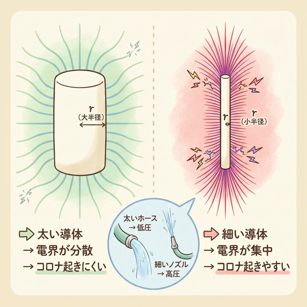 水道管にたとえると、同じ水圧でもノズルを細くすると水が勢いよく出るのと同じです。電界も、導体の半径が小さいほど表面に「ギュッと集中」します。
