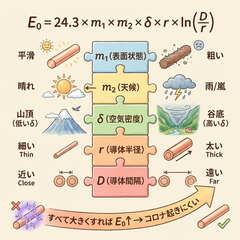 Peekの式は「臨界電圧E₀を上げたければ、式の中の値を大きくすればいい」と読めます。m₁↑(表面を滑らかに)、m₂↑(晴天)、δ↑(低地・低温)、r↑(太い導体)→ すべてE₀を上げる方向 → コロナが起きにくくなる。