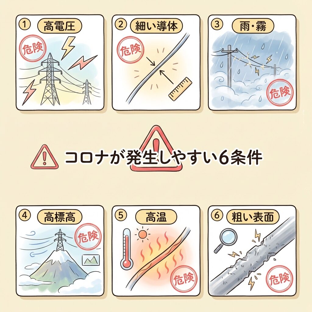 | 発生しやすい条件 | 高電圧、細い導体、雨天、高地(気圧低い)、高温、表面が粗い |