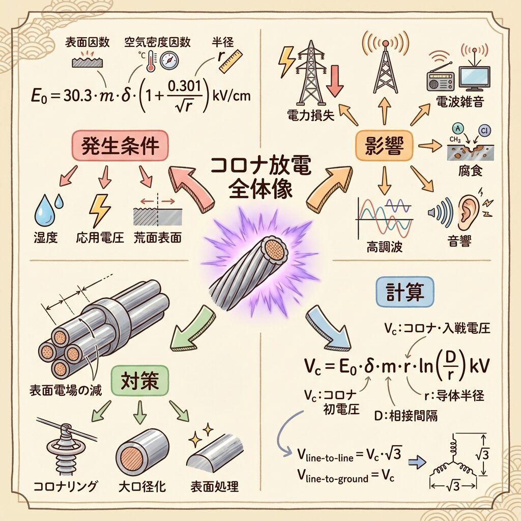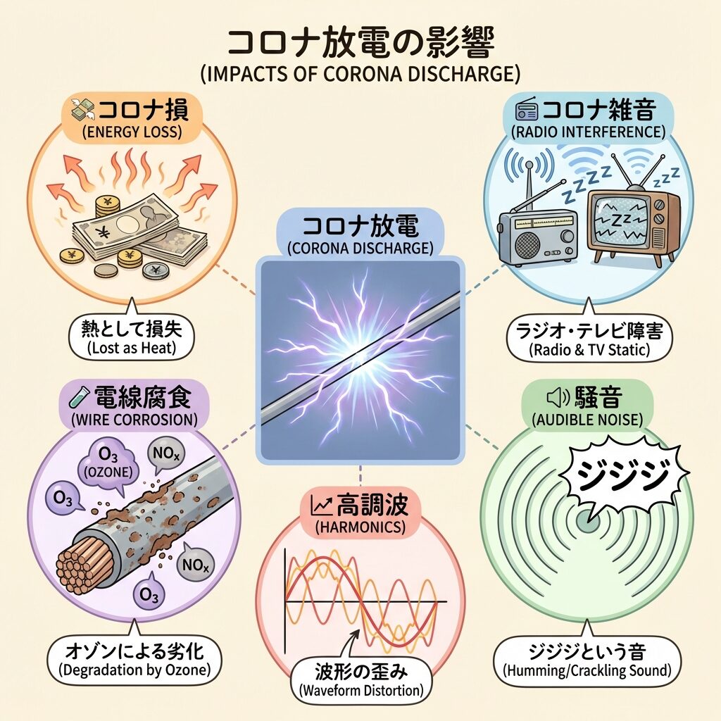 | 影響 | コロナ損(電力損失)/ コロナ雑音(電波障害)/ 騒音 / 電線腐食(オゾン) |