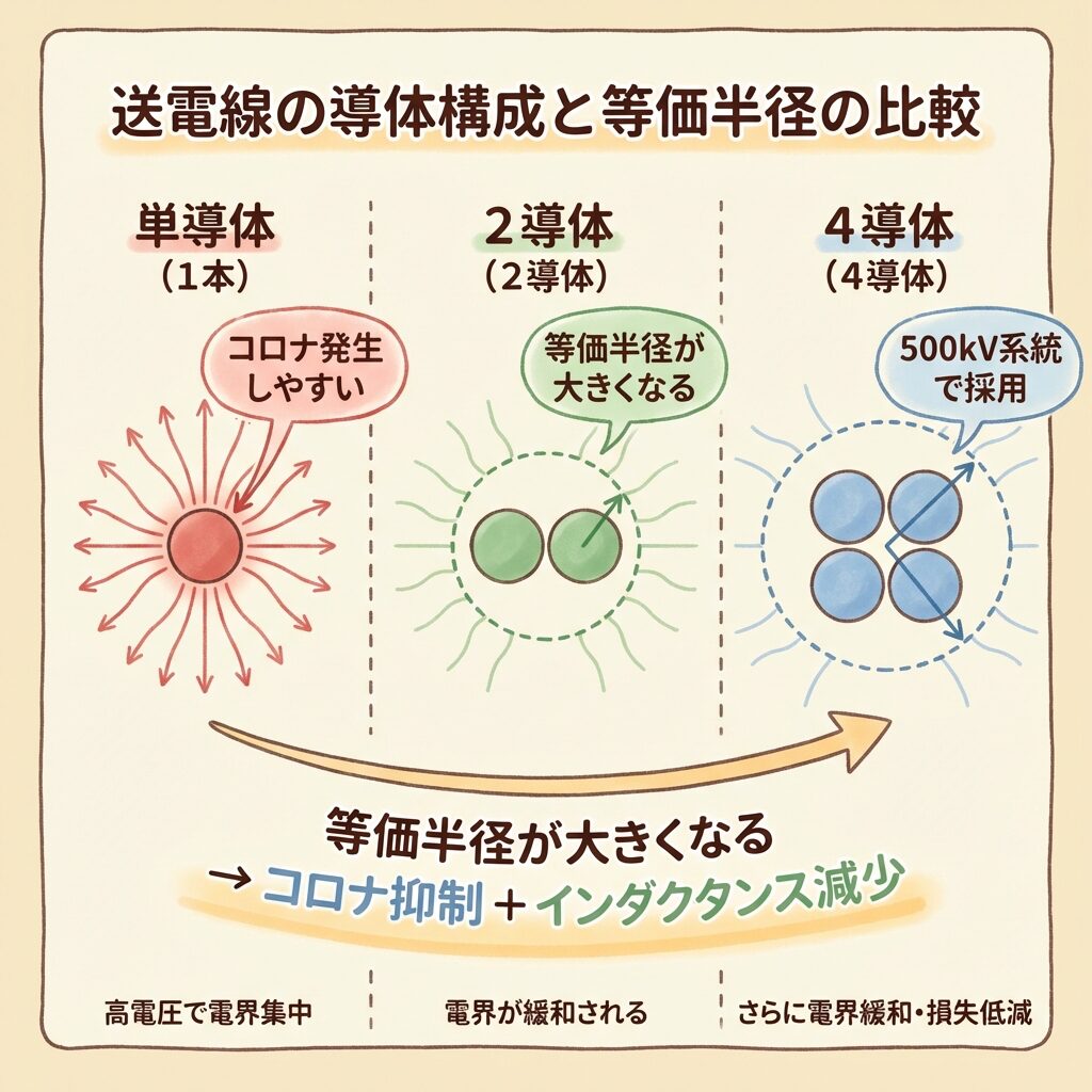 STEP 2:「多導体方式」→ 等価半径↑ → コロナ抑制○ / インダクタンス↓ → 送電容量↑○