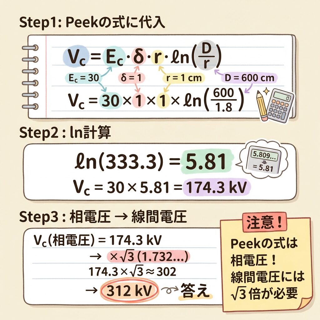 ① Peekの式で求まるE₀は相電圧(対地電圧)です。問題が線間電圧を聞いている場合は√3倍を忘れずに。