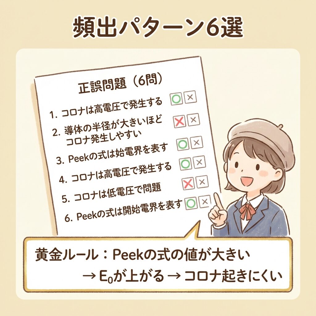 上の表の反対 ── 電圧が低い、導体が太い、晴天、低地(気圧が高い)、低温、表面が滑らか ── です。正誤問題では条件の逆転が狙われるので、「Peekの式の各要素が大きくなればE₀が上がり、コロナが起きにくくなる」と覚えてください。