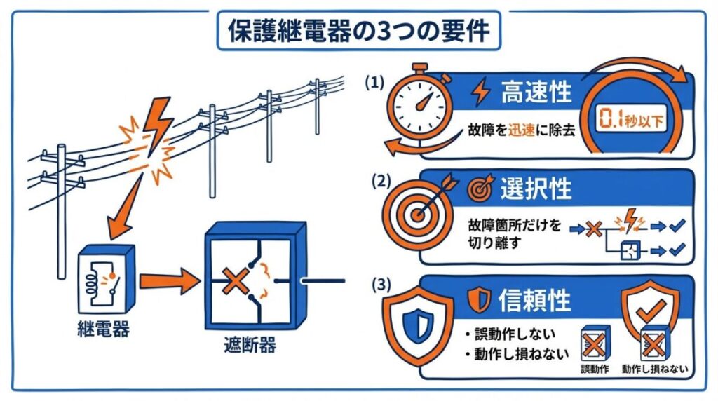 保護継電器には、次の3つの要件が求められます。この3要件は電験三種の論述系問題で問われることがあるため、それぞれの意味を正確に理解しておきましょう。