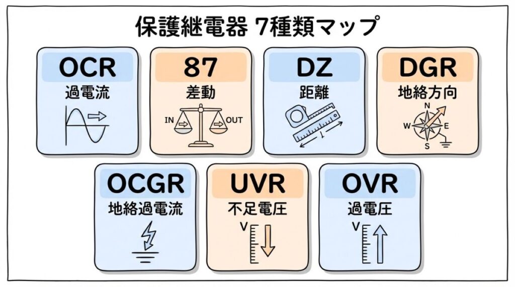 • 主要な保護継電器7種類の動作原理・保護対象・略号を一覧表で完全整理