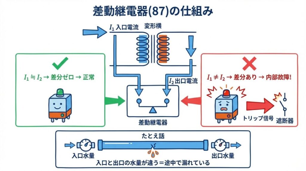 ② 差動継電器(87)|「入口と出口の電流が合わない=内部故障」