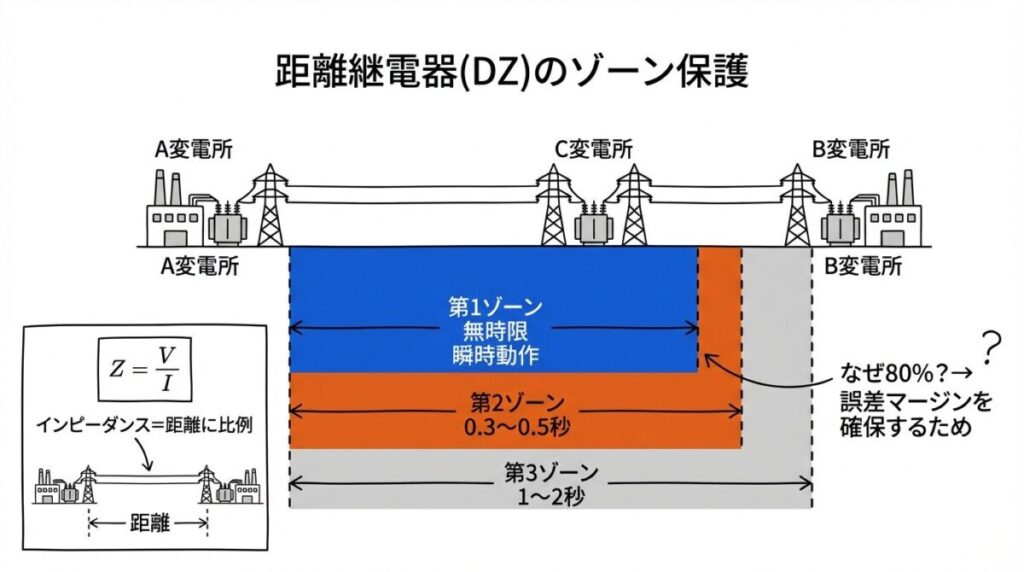 高速道路で事故が起きたとき、料金所から事故現場までの距離に応じて対応する管轄が変わりますよね。距離継電器も同じです。故障点が「自分の守備範囲(保護区間)」内かどうかをインピーダンスで判断します。守備範囲内なら即動作、範囲外ならその区間の継電器に任せます。