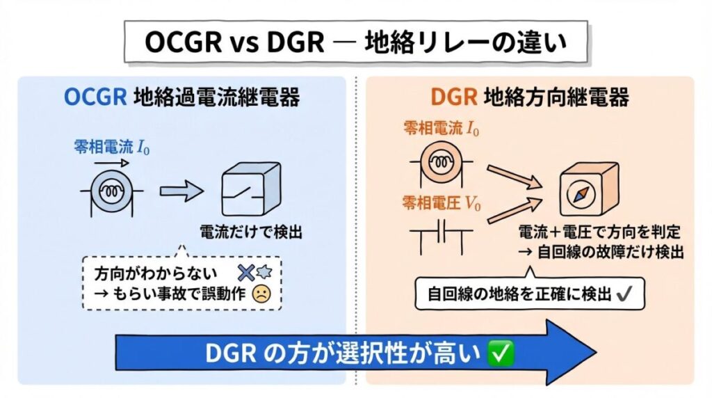 零相電流(I₀)と零相電圧(V₀)の両方を監視し、電力の方向から「自分側の故障か、外部の故障か」を判別する。OCGRの「方向判別ができない」弱点を克服した上位機種。