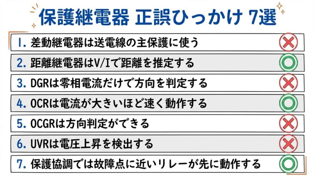 電験三種の電力科目では、保護継電器の種類と保護対象を問う正誤問題がほぼ毎年出題されています。出題パターンは「略号と名前の対応」「保護対象の入れ替え」「動作原理の記述の正誤」がほとんどです。略号を丸暗記するのではなく、「なぜその継電器が必要なのか」という原理から理解すれば、どんな問い方をされても対応できます。