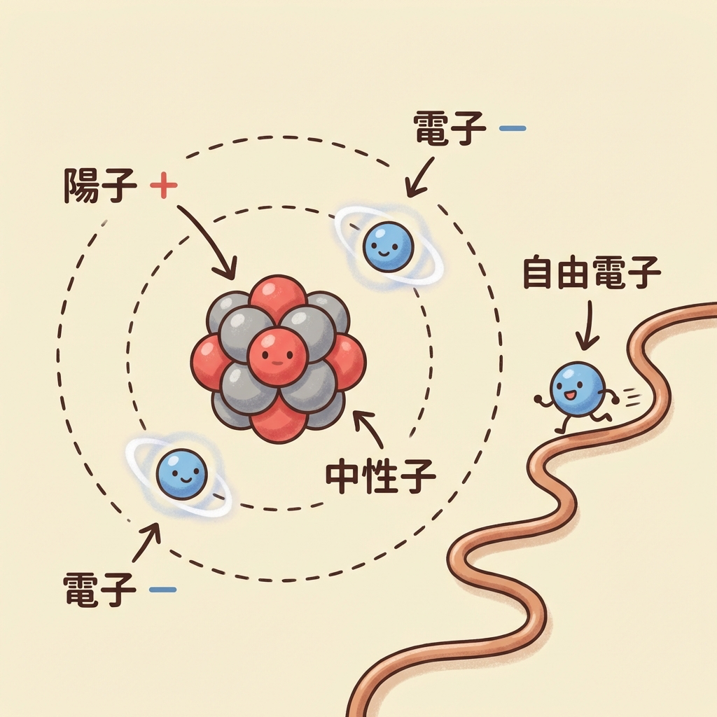 銅線(どうせん)のような金属の中には、原子核にあまり束縛されていない「自由電子」がたくさんいます。普段はバラバラにウロウロしているだけですが、ここに電池などで「力」を加えると、電子たちが一斉に同じ方向に動き出します。