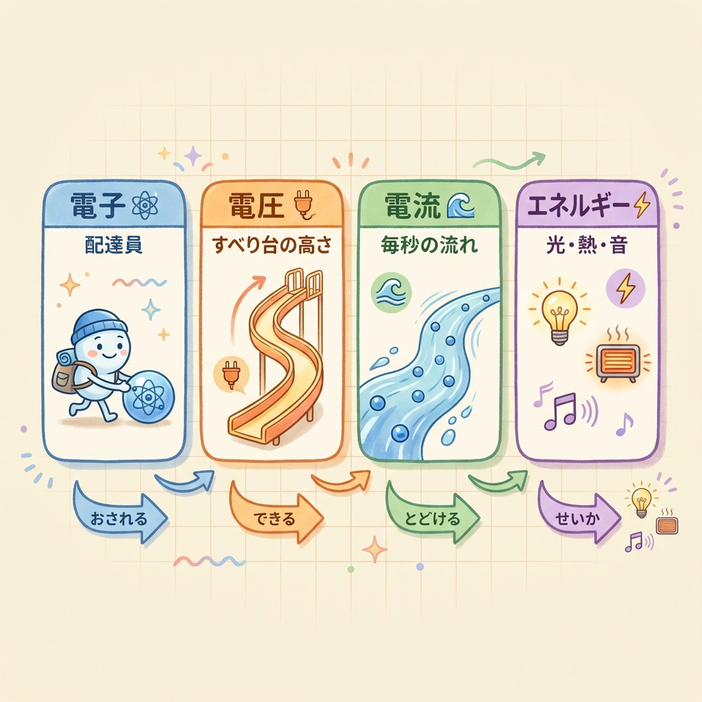 電子は「配達員」、エネルギーは「荷物」。この違いを知っているだけで、電気の理解がグッと深まります。